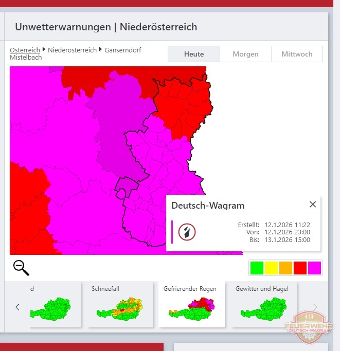 Aktuelles !! Glatteiswarnung !! Von Andreas Gindl - 12. Januar 2026 208 Facebook Twitter Google+ Pinterest WhatsApp Aufgrund bevorstehenden Schneeregens wird für Ostösterreich, besonders bei uns im Marchfeld und rund um Wien eine Glatteiswarnung bis morgen später Nachmittag vom Wetterdienst ausgesprochen! Bitte fahren Sie vorsichtig!
