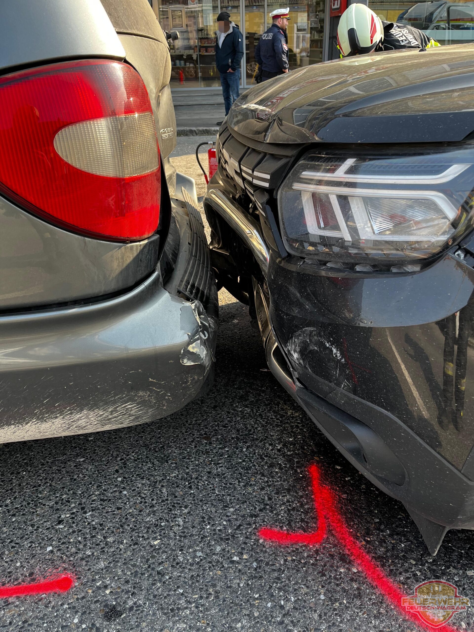 Beim Eintreffen an der Einsatzstelle wurden bereits zwei verletzte Personen vom Rettungsdienst versorgt. Durch den Auffahrunfall hatten sich zwei Fahrzeuge über die Anhängerkupplung ineinander verkeilt. Unsere Tätigkeiten umfassten zunächst die Absicherung der Unfallstelle sowie den Aufbau eines Brandschutzes.