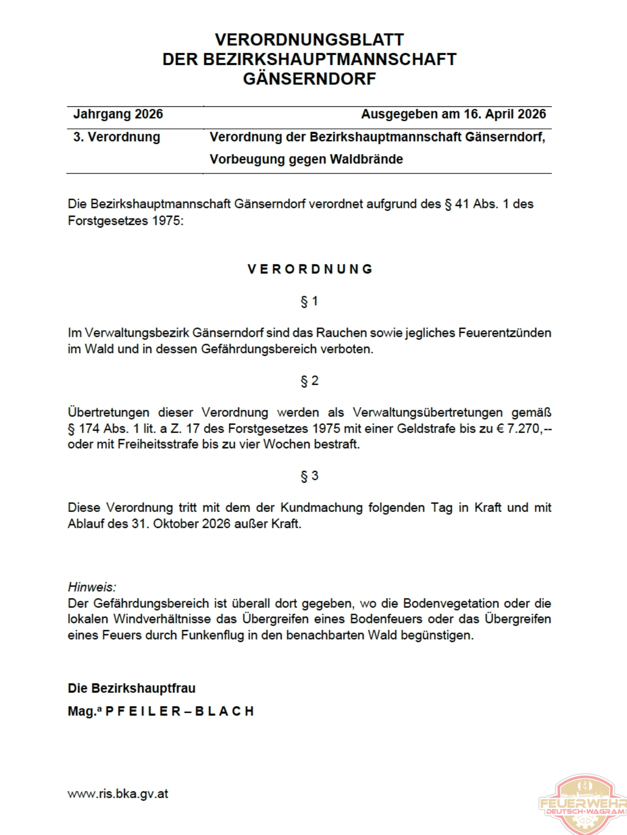 Aufgrund der aktuellen Witterungsverhältnisse wurde von der Bezirkshauptmannschaft Gänserndorf, am 16.04.2026, eine Waldbrandverordnung erlassen. Im gesamten Verwaltungsbezirk ist das Rauchen sowie jegliches Entzünden von Feuer im Wald und in dessen Gefährdungsbereich verboten.
